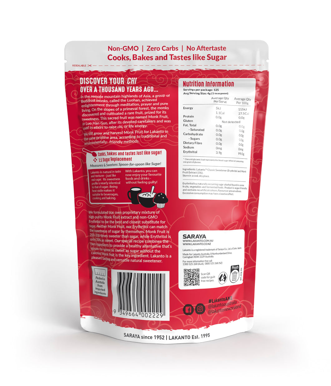 Lakanto Monkfruit Sweetener is a low calorie, zero glycemic sweetener that is just like sugar. It is made from Monk Fruit which was used for centuries in eastern traditional herbalism to increase chi and well-being, earning it the nickname “The Immortals’ Fruit”. We still grow and harvest Monk Fruit for LAKANTO® in the same pristine area and according to traditional and environmental methods.